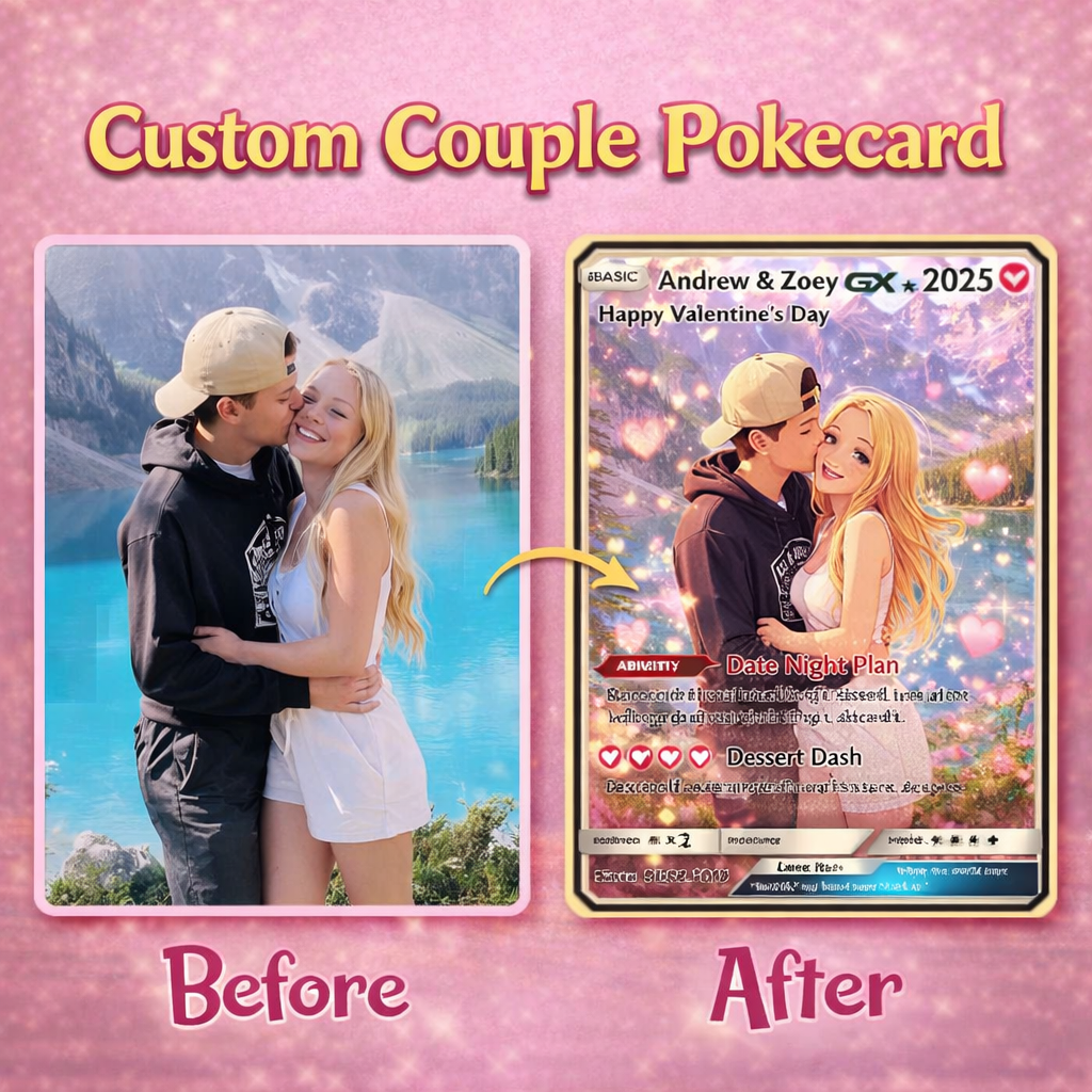 Upload your photo and we transform it into a custom couple Poké-style card. Fully personalized, premium quality, and made to be treasured forever — the ultimate gift for someone special.